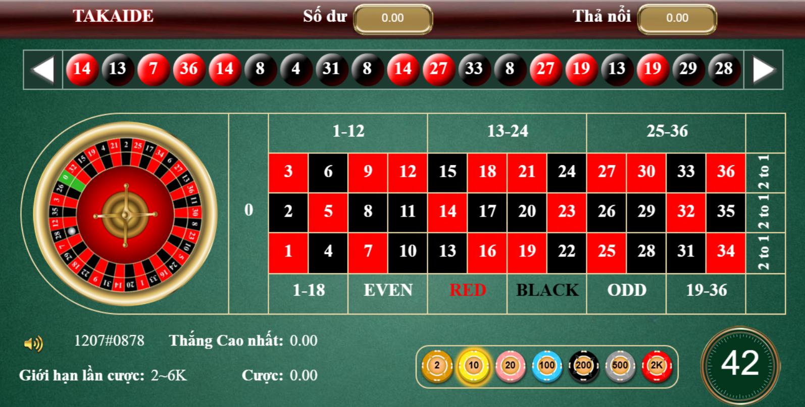 Luật chơi Roulette tại 1Onebox63 rất đơn giản: Trước tiên, anh em sẽ phán đoán quả bóng sẽ dừng lại ở số mấy, sau đó tiến hành đặt cược vào ô số đó. Anh em hãy chọn những đồng xu ở góc dưới bên phải màn hình hiển thị, những đồng xu này tương ứng với số tiền anh em muốn cược. Các đồng xu 2, 10, 20,… 2.000 tương ứng với số tiền để anh em đặt cược là 2.000 VNĐ, 10.000 VNĐ, 20.000 VNĐ,…2.000.000 VNĐ.