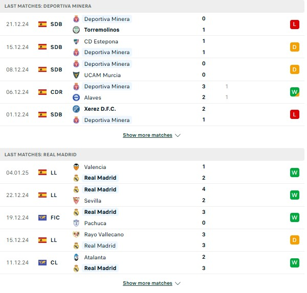 2 trận gần nhất của Minera tại Cúp Nhà Vua có tối thiểu 4 bàn. 4/5 trận vừa qua của Real tại Cúp Nhà Vua cũng chung diễn biến. 6/9 trận gần nhất của Minera có tổng bàn chẵn. 5/7 trận sân nhà vừa qua của Minera cũng chung kịch bản.